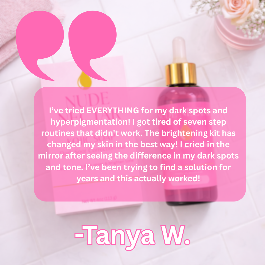 The Nude Nectar Brighten & Tone Kit is formulated to improve the look of post-acne marks, dark underarms, & hyperpigmentation in as little as 4 WEEKS!